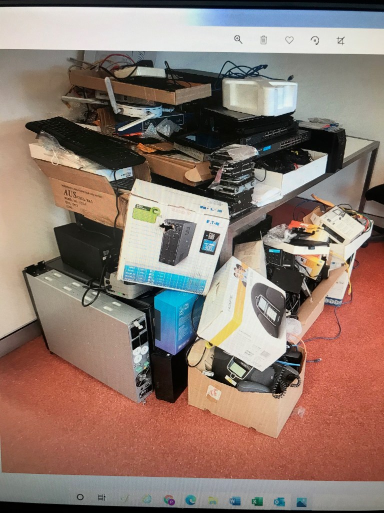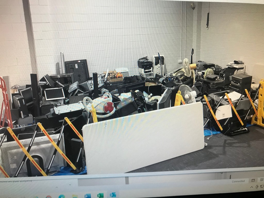 Typical clear-out of old office screens, docking stations, etc.